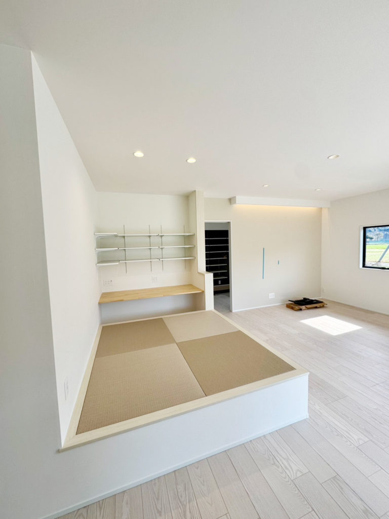 大きな窓からたっぷりと光が差し込む明るいリビングと、キッチンをぐるりと回れる動線が魅力。家事をしながら、お子さまの様子を見守れる小上がりスペースがあり、家族が自然とつながりのびのびと過ごせる心地よい空間を叶えました。