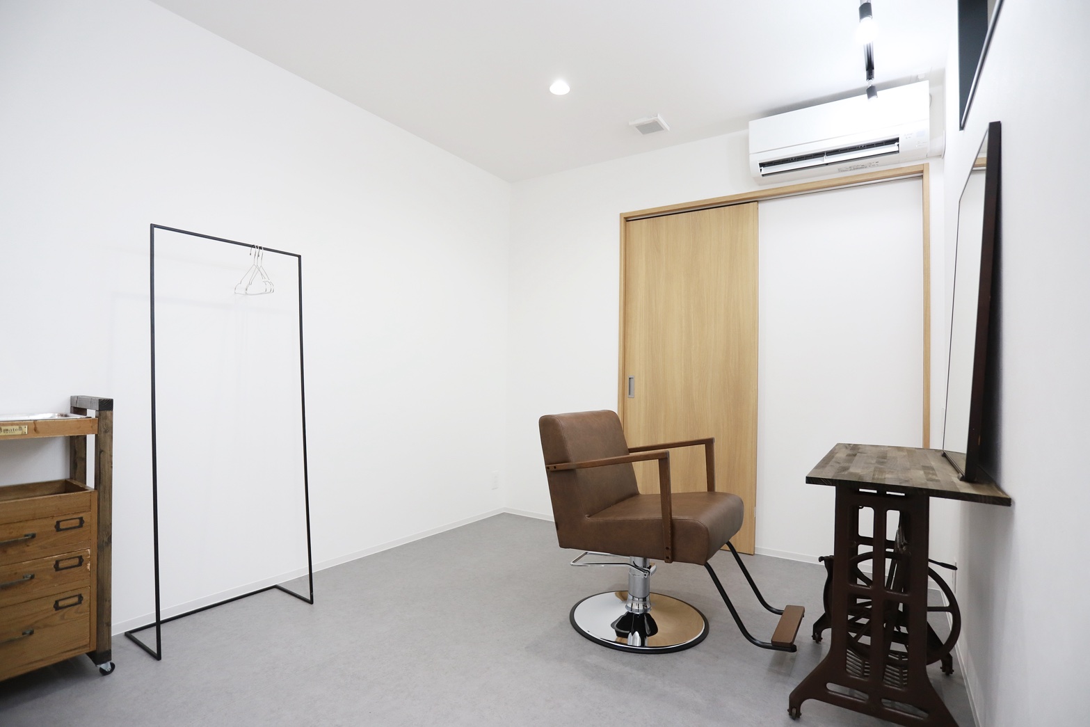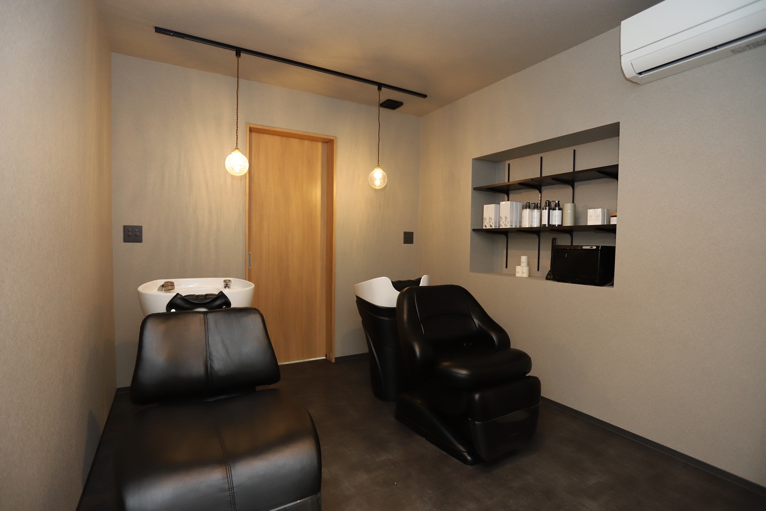 シャンプースペースは壁紙や床の色を変えて、よりリラックスしていただける空間に。商品の収納はニッチに。
