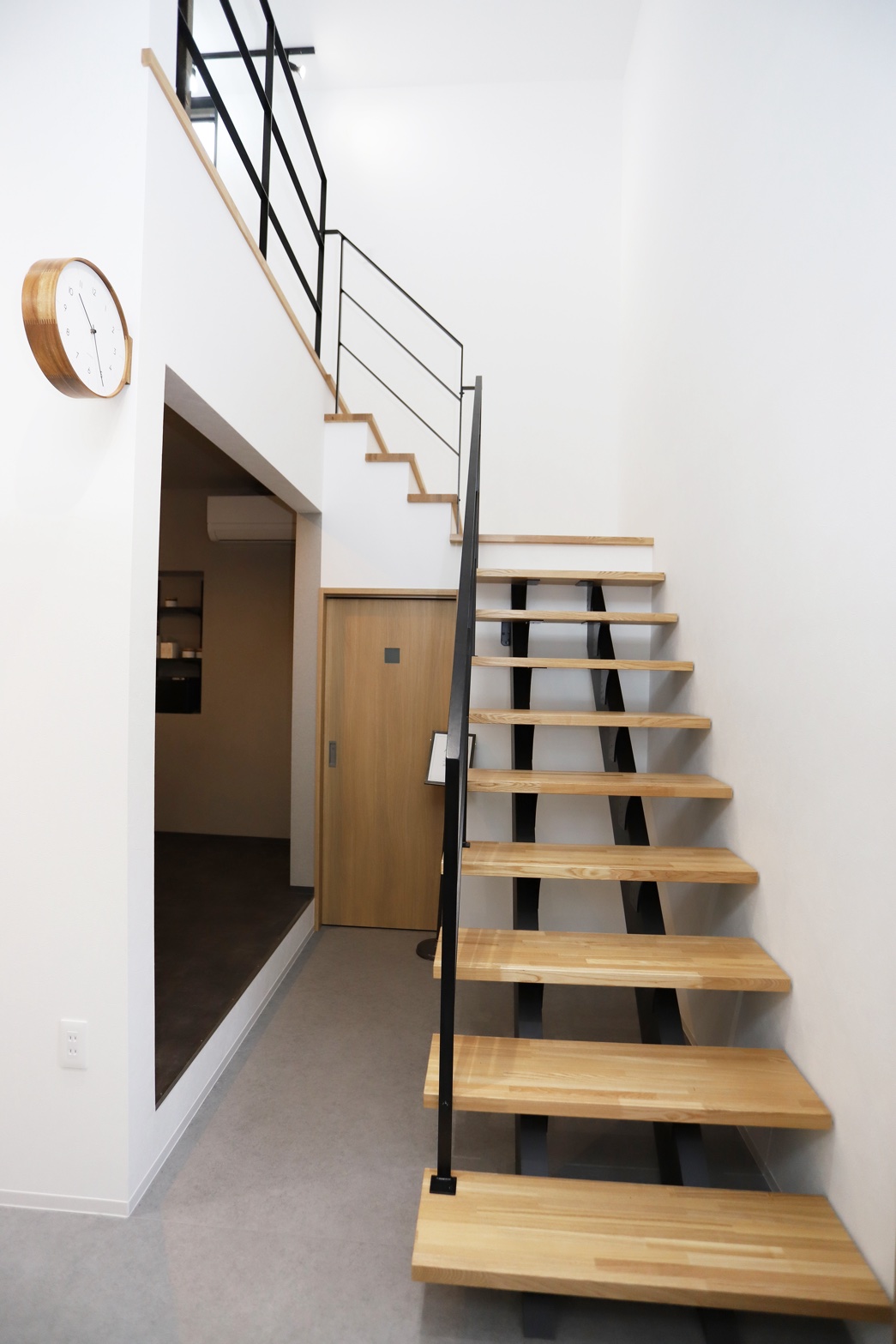 白を基調とした内装に黒のアイアンが映える空間。吹き抜けで高い天井は開放感があり、リラックスできる空間に。